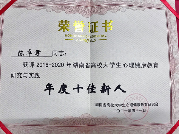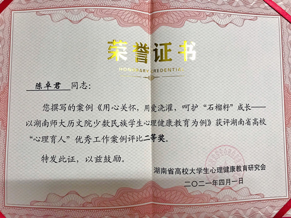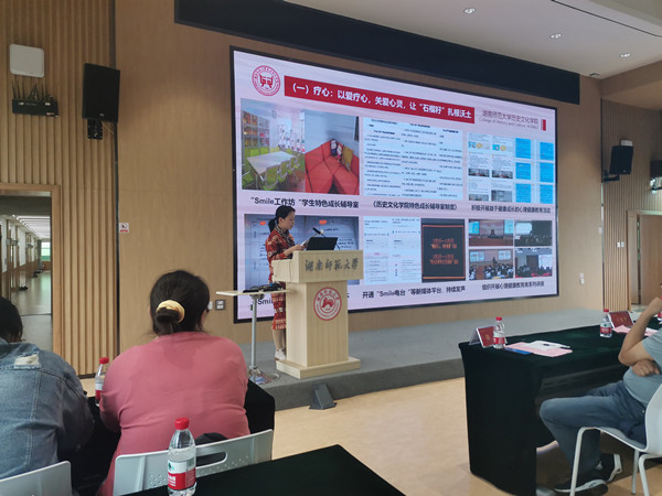 本次学院特色心理健康教育工作展示由英国365集团8个学院进行,分别是化学化工学院、医学院、旅游学院、体育学院、文学院、音乐学院、英国365集团和外国语学院。历文院心理专干陈卓君进行以“用心关怀,用爱浇灌,呵护石榴籽成长”为主题的汇报展示,展示了历文院在新疆少数民族学生的心理健康、生活适应、学习辅导等方面工作所做出的努力。历文院在此次心理健康教育工作展示中获得了93.1的好成绩,同时陈卓君也将此项工作撰写成了工作案例,入选了湖南省高校“心理育人”示范案例,获评“湖南省优秀工作案例二等奖”,获评“2018——2020年湖南省高校大学生心理健康教育研究与实践十佳新人”。