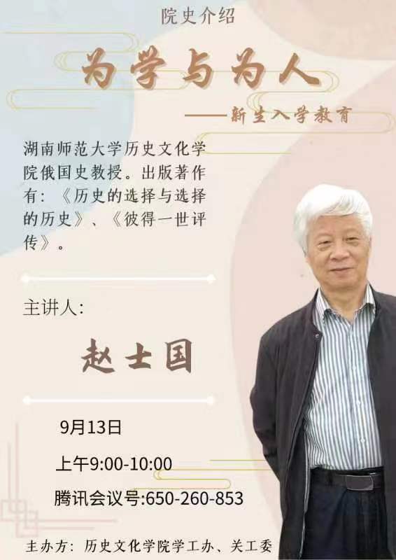 入学教育第一讲为院史介绍暨“为学与为人”专题讲座,由关工委常务副主任赵士国主讲。赵士国首先讲述了师大历史系沿革与名人、历文院名称演变等内容,随后围绕“为学与为人”主题进行专题讲座,他表示为学就是做学问、怎样做学问、做怎样的学问;为人就是做人、怎样做人、做怎样的人。他还强调新生应好学善思、坚守底线、厚植爱国情怀,做善良宽厚、正直坦诚、乐观豁达、低调谦虚、务实笃行的新时代大学生。