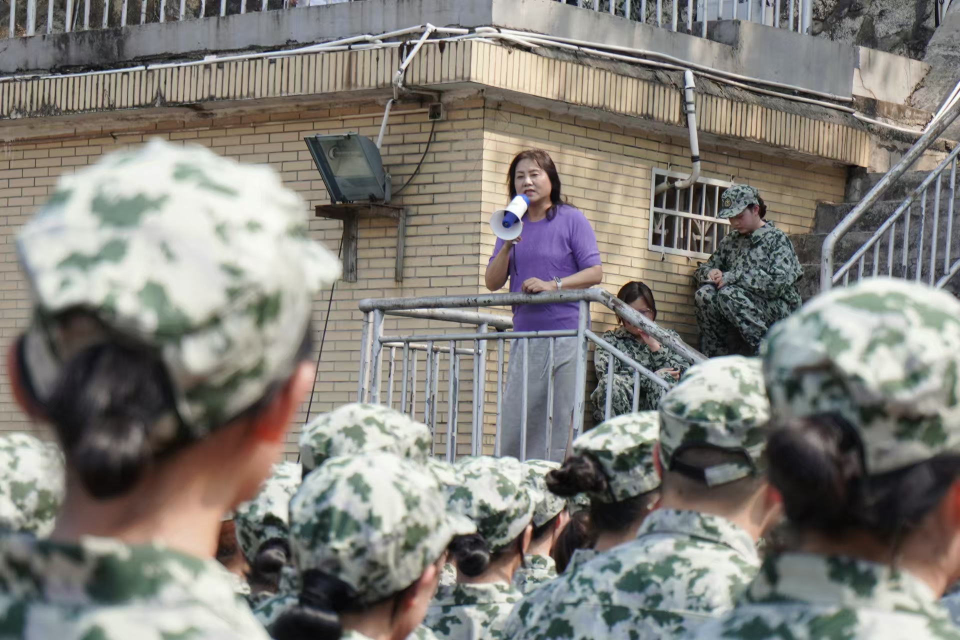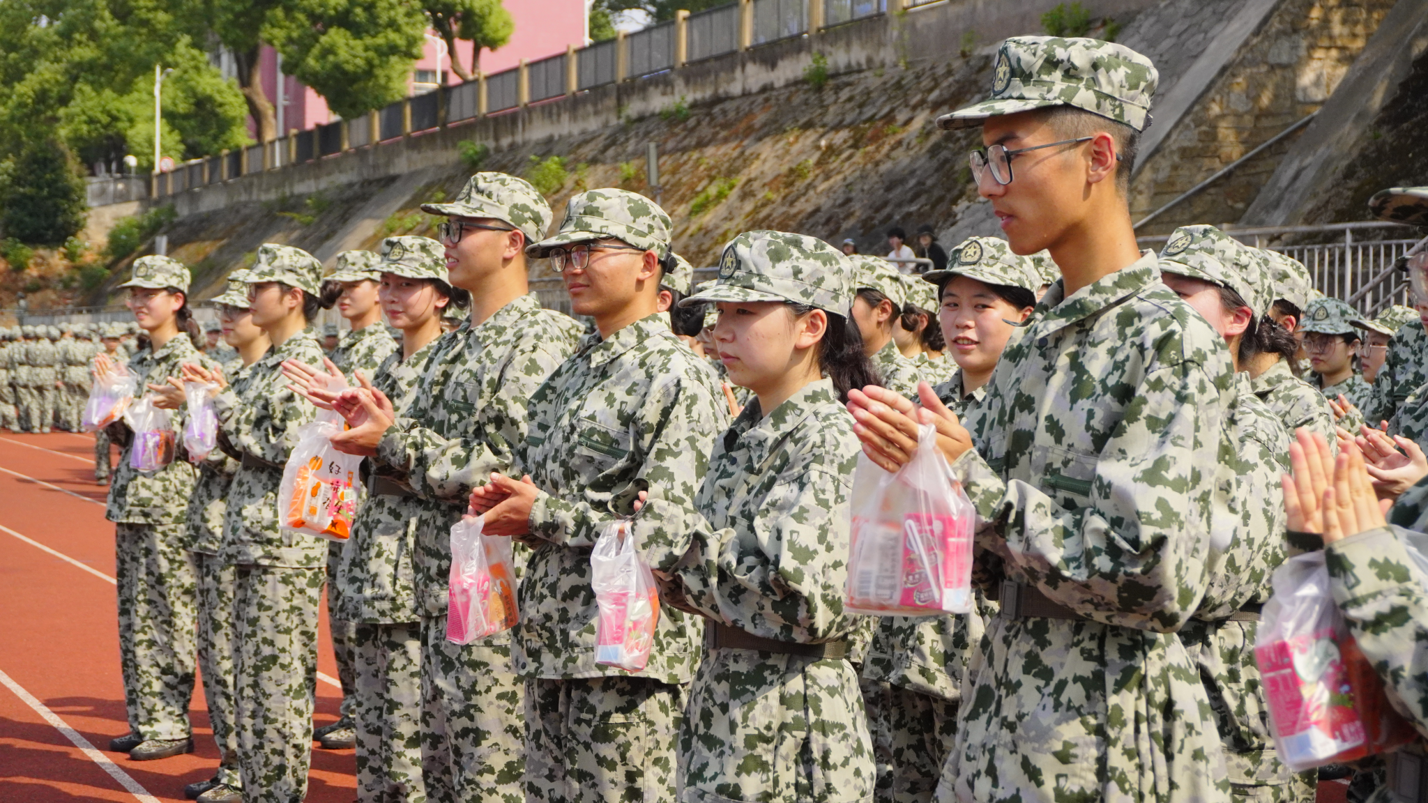 马欣了解军训训练情况后,对教官的辛勤付出表示衷心的感谢,赞许了同学们在军训过程中坚持不懈的品质和昂扬向上的精神风貌,鼓励同学们再接再厉,展现历文学子风采,并对军训后的方阵队列展演表示期待。她向同学们提出两点建议,一是要珍惜时间,争分夺秒进行训练,取得让自己满意的成绩,二是要明确自我目标,朝目标努力奋斗。最后,马欣带领学工办老师及新生班导为同学们发放慰问礼品并送上中秋祝福。