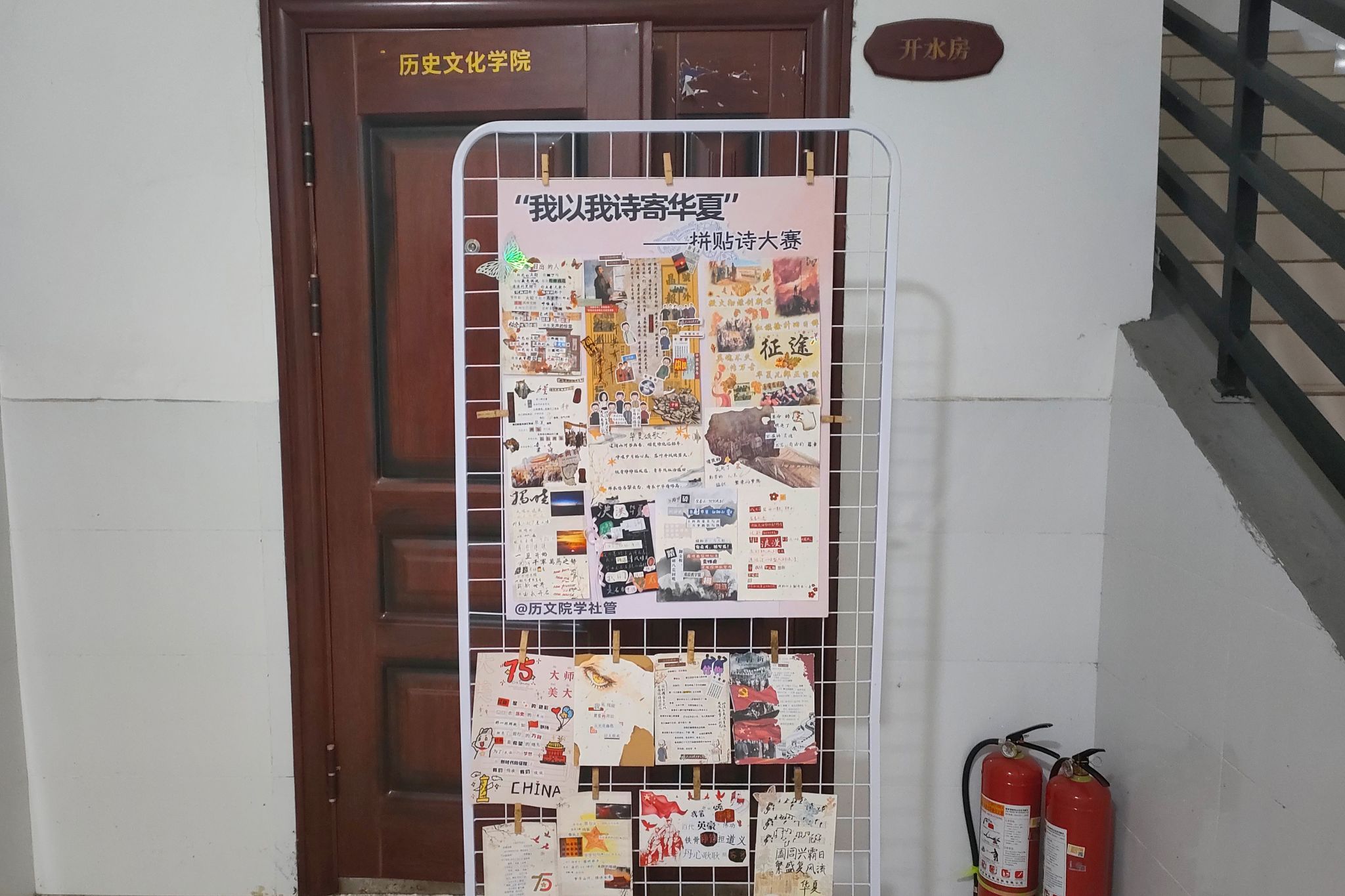 此次活动于10月20日正式开始,在张公岭校区和二里半校区两地同时进行。学生积极参加并通过绘画、贴纸、诗词等多种艺术形式创作多幅优秀拼贴诗作品,为作品注入个人思考和爱国情感。10月27日由工作人员收集全部作品并进行初审,后提交给院关工委常务副主任赵士国和学工办主任陈敏两位大赛评委。评委们从诗歌内容、页面布局等多方面对参赛作品进行评审,注重作品的原创性、设计性与主题性,最终于11月15日选出“最佳内容奖”12人和“最佳设计奖”12人。评审结束后,优秀作品和获奖作品分别于张公岭综合楼三楼和文渊楼一楼进行展示。