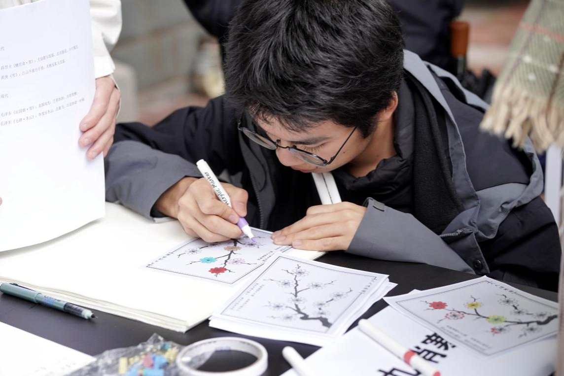 此次活动分为绘制九九消寒图、制作甜酒酿汤圆、冬日剪纸、梅瓶插花四个部分。活动开始前,社团工作人员提前绘制九九消寒图和剪纸图案,为同学们提供示范。活动期间,与会成员按照自己喜好选择活动项目并参与其中,在现场工作人员指导下,制作出了精美的手工作品,按照自己的审美描绘出心目中的冬至文化。同时,食尚协会带领会员们制作甜酒酿汤圆,并在现场进行分发。马欣与同学们一同制作梅瓶插花,了解冬至习俗的深厚底蕴。活动结束后,所有活动成员在历文院前坪合影留念。