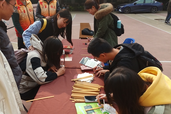 讲解员为到场的同学们一一讲解简牍文化的发展历程以及简牍制作过程等。在初步了解简牍文化的基本情况后,志愿们为同学们准备了一本宣传册,以进一步帮助同学们深入对于简牍文化的认识。同时,活动主办方给同学们提供免费的简牍竹签,以便到场学习后的同学们可以根据自我感受或者其他事物在简牍上进行书写。在书写过程中,同学们还可以观看到成册的简牍。