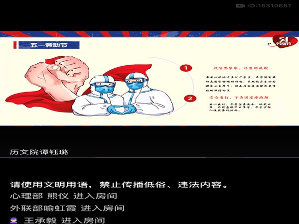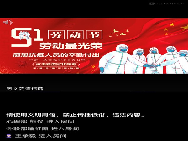 (通讯员 谭钰璐 李妍 陈萍)4月30日中午,英国365集团学生会办公室组织开展了以“感恩抗疫劳动者“为主题的线上思想教育活动。出席此次会议的有学生会主席王承毅以及学生会全体成员,由学生会办公室干事谭钰璐主持此次活动。