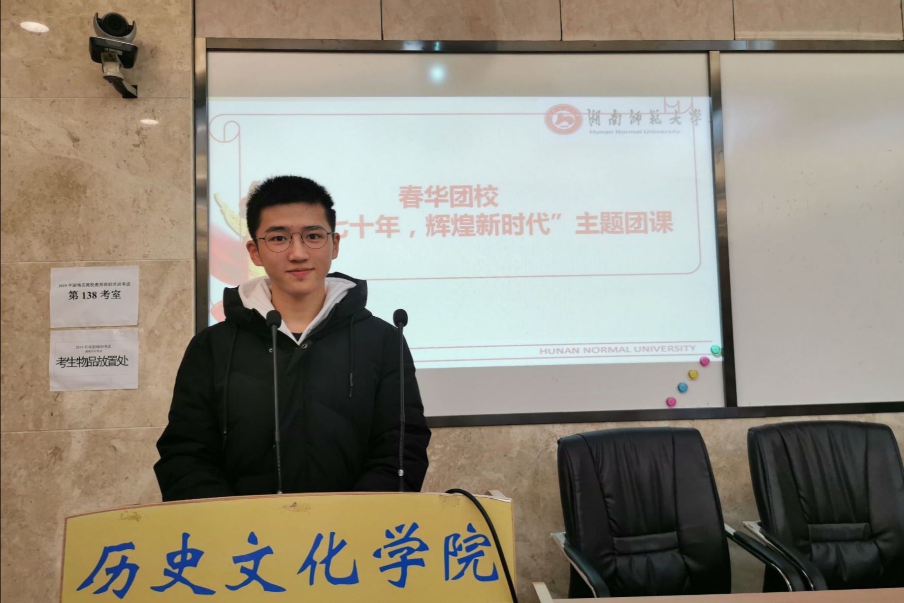 培训伊始,谭吉华大概介绍了此次培训的主题,并表示其目的是为了培养新时代的大学生和新青年。随后,他提出了中国目前所面临的困难:中美贸易摩擦、香港问题等,通过最新时政引起了参加成员的兴趣。接着,他从中国在七十年间奋斗历史,如今中国的奋斗努力和取得的成就,当今人们获得的深刻启示及鼓励新青年奋勇拼搏,以及开创新征程四个主题讲述了此次的团课内容,展现了中国从“站起来”“到“富起来”“再到”强起来”的发展奋斗史,在前人的经验总结上引导后人避弯路,最后表达了对未来的美好憧憬。