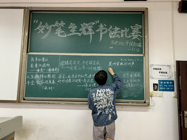 本次比赛共由“蓝田翔梦”演讲竞赛(308教室)和“妙笔生辉”书法竞赛(307教室)两部分组成。首先进行的是“蓝田翔梦”演讲竞赛,随着主持人宣布比赛正式开始,17名参赛选手轮流上台朗诵作品、讲述故事,各抒己见。评委老师认真负责,对选手依次提问,在考察选手演讲技巧与水平的同时,也审视了对于作品蕴含的思想内涵和教育情怀的理解,最后再依次进行评分。与之同时进行的是“妙笔生辉”书法竞赛,12名参赛选手在规定时间内分别完成了指定内容的粉笔字和钢笔字的正楷书写,以集中考察参赛选手的汉字书写水平,时间截止后统一收卷,评委老师随后分别进行评分。最后,在现场同学的一片掌声之中,本次初赛得以圆满结束。