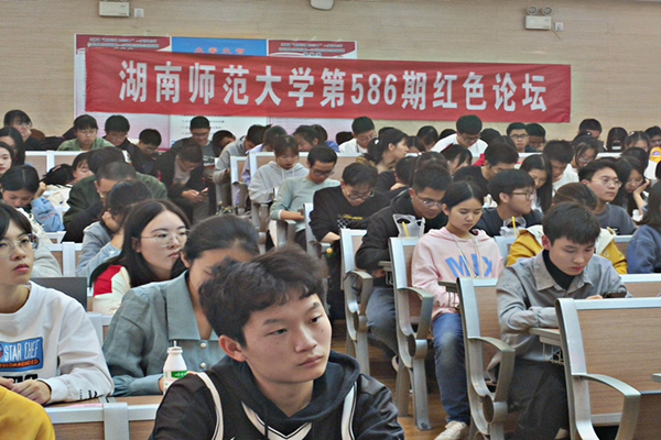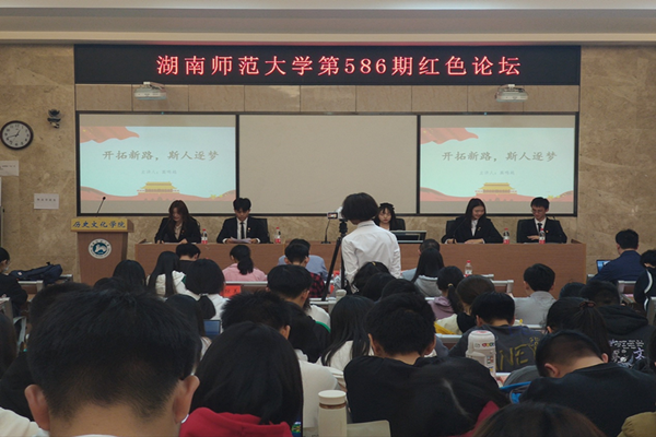 活动中,陈卓君致辞,讲话内容肯定了同学们欢迎习近平总书记考察的积极与热情,鼓励历文学子加强习近平主席在湖南考察时重要讲话精神的学习。同时也回顾了历文院举办红色论坛的历史,并对青年学生寄予了厚望,最后号召大家承担时代使命,传承弘扬发展湖湘文化。四位主讲人围绕主题依次进行演讲,高鸣越表示创新是时代的灵魂,鼓励同学们在时代的呼唤下勇于创新;许程超结合网络热点和亲身经历,为同学们讲述了继承传统、奉献时代的必要性;吴晓莉号召同学们弘扬爱国主义精神,脚踏实地做实事;李俊凯说明青年要以习近平总书记的讲话思想武装头脑,指导实践,争做时代的弄潮儿。在四位主讲人讲话过后,向常水以通俗易懂的语言,再一次为我们诠释了青年应如何牢记使命,不负青春,同时也简要肯定了此次红色论坛中“牢记殷殷嘱托,青年有话想说”环节的创新之处,表明了此次论坛的不足之处,对论坛提出了更高的期望。