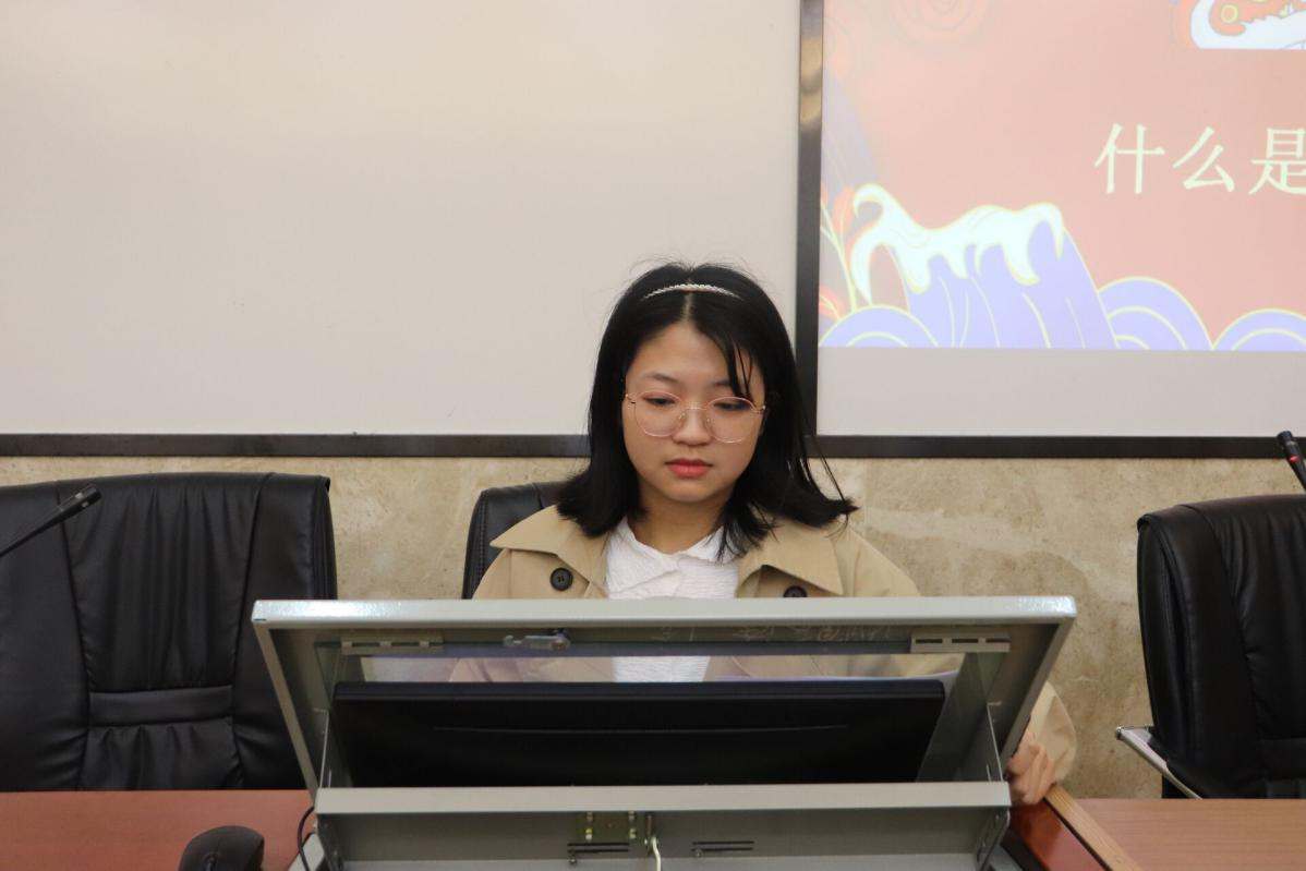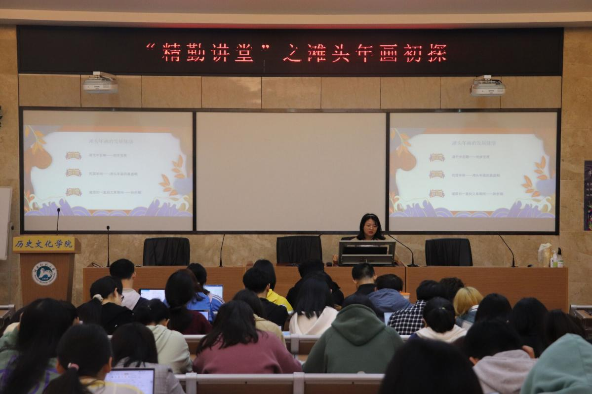 在主持人向大家介绍本次主讲人以及讲堂主题后,贺叶琳便带领大家进行滩头年画的价值资源挖掘与创新发展路径的初探。她首先向大家介绍了滩头年画的起源,并展示了优秀的滩头年画作品。然后通过理清滩头年画发展脉络,让同学们更加近距离地了解年画,并分析丰富多样的年画种类,象征着各种美好的祝福,这无一不深深吸引着同学们。最后主讲人阐述年画当下的困境并对其转型提出创新性的建议,希望滩头年画能有更好的前景。在讲堂过程中,同学们专心致志,对年画有了更加深刻的认识。