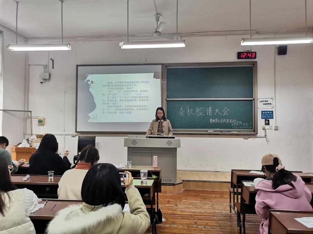 主持人向参与活动的同学简要表示欢迎后,开始了活动流程的简要介绍。在同学们的期待下,第一个活动环节——”脸谱知识大会”拉开帷幕。主讲人通过介绍脸谱的定义、分类等使同学们对脸谱有了初步认识,并借助幻灯片、视频等手段展示各类不同的脸谱,在视听结合中让同学们了解了其背后颜色、花样的深刻意蕴。