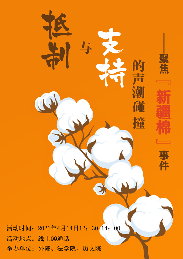 (通讯员 芦金宝) 四月南风复苏季,正是棉花播种时。同时,一场“棉花风暴”也在网络上席卷而来。“H&M抵制新疆产品”“H&M碰瓷新疆棉花”“支持中国制造”等话题在微博上持续发酵,事关国家名声,引起广泛关注。为此,历文院、法学院、外国语学院三院青年评论部在线上以图文评论的方式举行以“抵制与支持的声潮碰撞——聚焦新疆棉事件”的主题评论沙龙活动。此次评论沙龙由线上举办,三院评论员参加此次活动。