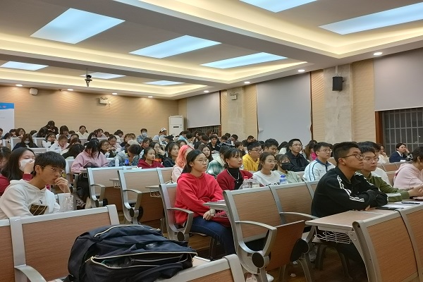 讲座伊始,胡含兵首先分享了自己的个人学习经历,引起了同学们的共鸣。随后,他向大家分析人生规划问题,着重提出了大学期间拥有一个明确清晰的规划的重要性,并且针对各个年级给出了自己的方案。胡含兵同时分享了个人的参赛经历,他从大学里的社会实践说起,讲述了自己将“黑马日语”这个项目孵化落地的过程,分享了自己平衡实践与学习的经验方法,并为每一位同学提供了真挚的建议。现场气氛热烈,与会学生认真听讲,并随时给出积极的反馈。