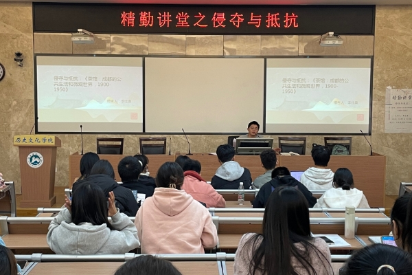 在主持人向大家介绍本次主讲人以及讲堂主题后,李佳奥首先介绍了作者王笛及其研究成果,分析了其从社会史到新文化史、微观史的研究转变。随后,他阐释了《茶馆》与新文化史、微观史研究的深入关系和其他理论对《茶馆》的影响,并通过分析《茶馆》与社会、经济、政治的关系,理清其叙事结构,得出核心论点:茶馆作为一个微观世界,体现了国家权力同一性的侵夺与地方文化独特性的抵抗。最后李佳奥引导大家探究《茶馆》的价值与两点思考。在接下来的提问环节中,同学们积极发言提问,李佳奥也耐心地回答了大家的问题,现场气氛十分热烈。