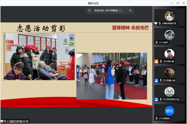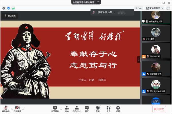 随后,邓丽华针对当代如何更好地纪念雷锋精神这一话题,结合丰富志愿活动经验,给出了发人深省的答案,指出当代青年纪念雷锋精神,应将善意和热爱注入每一次志愿活动中去,在奉献中体现人文关怀,在陪伴中体现道德坚守。最后以董必武先生的诗作结,再次表达了对万古长青雷锋精神的讴歌。