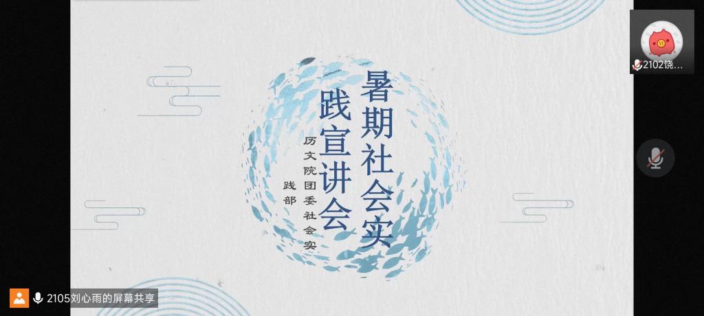 (通讯员 饶姝妍 杨灿)5月20日中午,由团委实践部组织的2022年暑期社会实践宣讲会通过腾讯会议线上开展。此次活动邀请到了院党委副书记马欣发表讲话,院团委书记兼18、19级辅导员陈卓君、院学工办老师兼20级辅导员周冲、院学工办老师兼21级辅导员李青到场,对暑期实践感兴趣的2021级同学参加。
