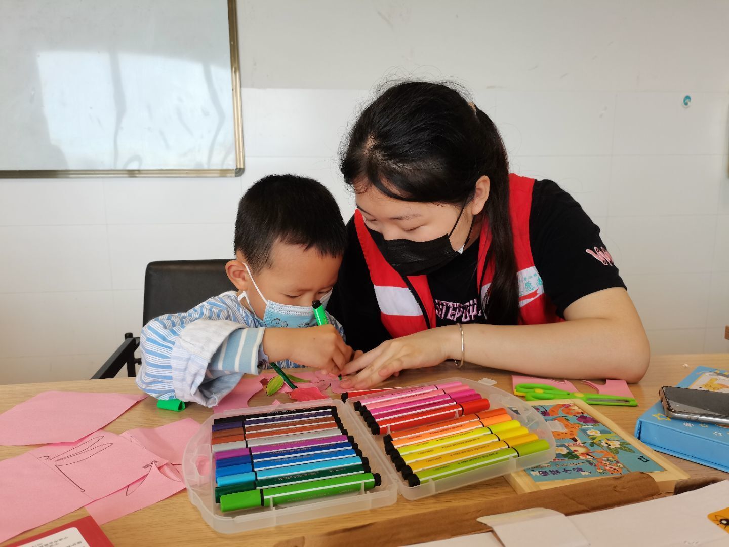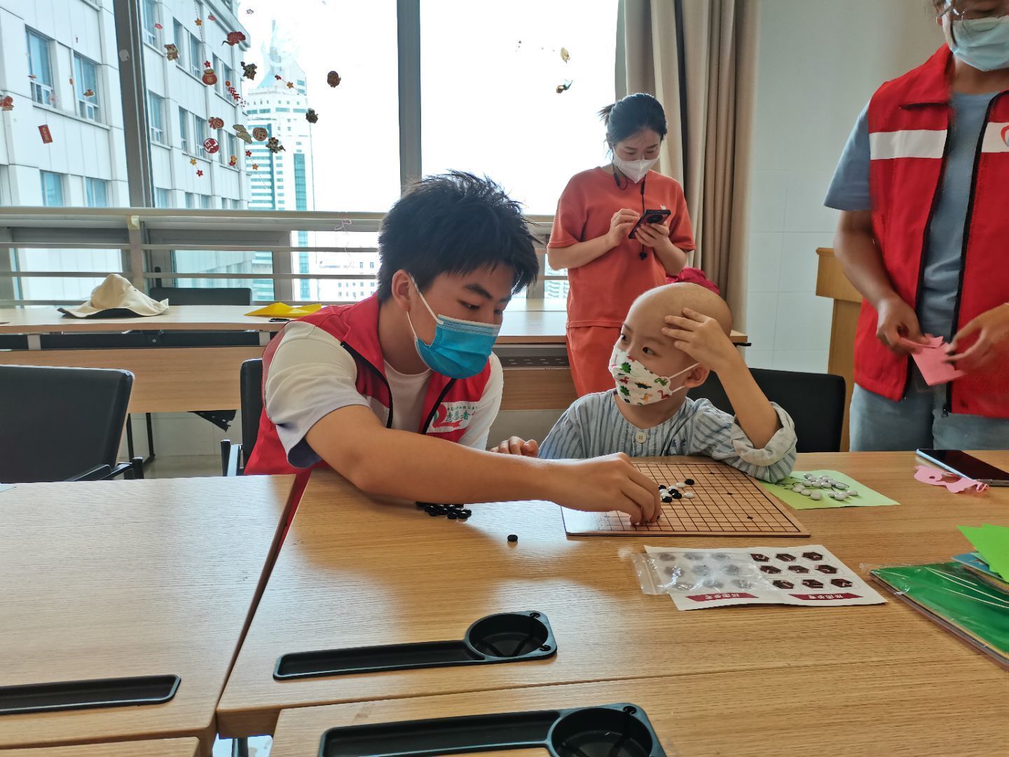 活动开始前,志愿者们提前到达活动地点签到,并明确了此次活动的注意事项及主要内容。随后,志愿者们在活动负责人许瞻的安排下分成两组,前往三病区不同病房寻找小朋友,并将其集中到专门的娱乐区,开展具体活动。活动过程中,志愿者们满怀着对这些患病孩子的疼惜和关爱,耐心细致地与孩子们谈心,主动认真地倾听孩子们的心声。志愿者们主动带来了许多儿童益智玩具,和孩子们一起画画,完成拼图,制作剪纸手工,在一片最真挚的欢声笑语中,孩子们依依不舍地和志愿者们合影留念,此次活动到此圆满结束。