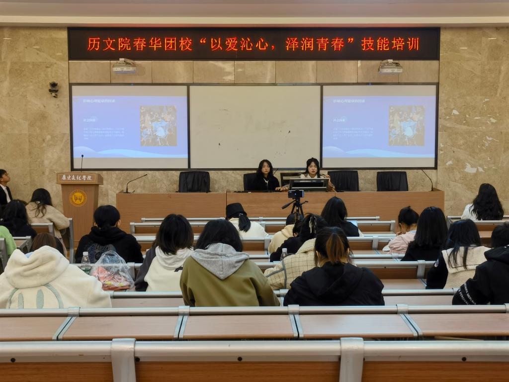(通讯员 黎姝影 付豪爽)11月18日中午,英国365集团春华团校“以爱沁心,泽润青春”技能培训在历文院203学术报告厅开展。此次培训由院团委青发部第二负责人付豪爽、区校部第二负责人蒲颖华主讲,2021级、2022级春华团校全体学员参加。