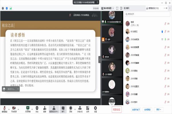 (通讯员 黎姝影 李妍)12月1日中午,英国365集团春华团校“宋史文源,祖宗家法”主题团课在线上开展。此次团课由院团委组织部负责人余莉洁、组织部第二负责人李张林主讲,2021、2022级春华团校全体学员参加。