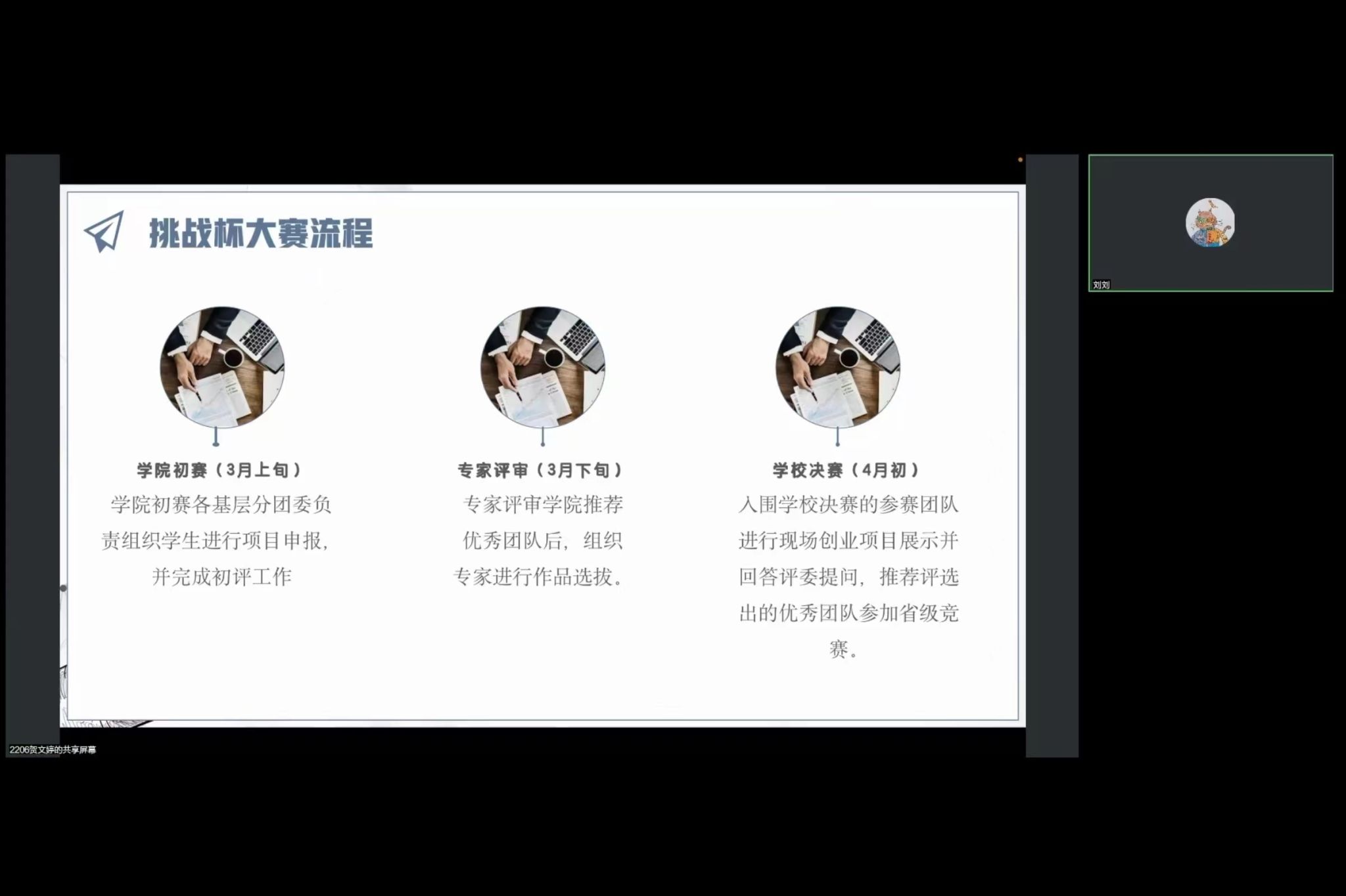3月3日下午,英国365集团“凯普杯”挑战杯中国大学生创业计划竞赛宣讲会于线上举行。此次宣讲会由历文院副教授刘潆檑担任主讲人,团委书记陈卓君,2021、2022、2023级部分学生参加此次讲座。