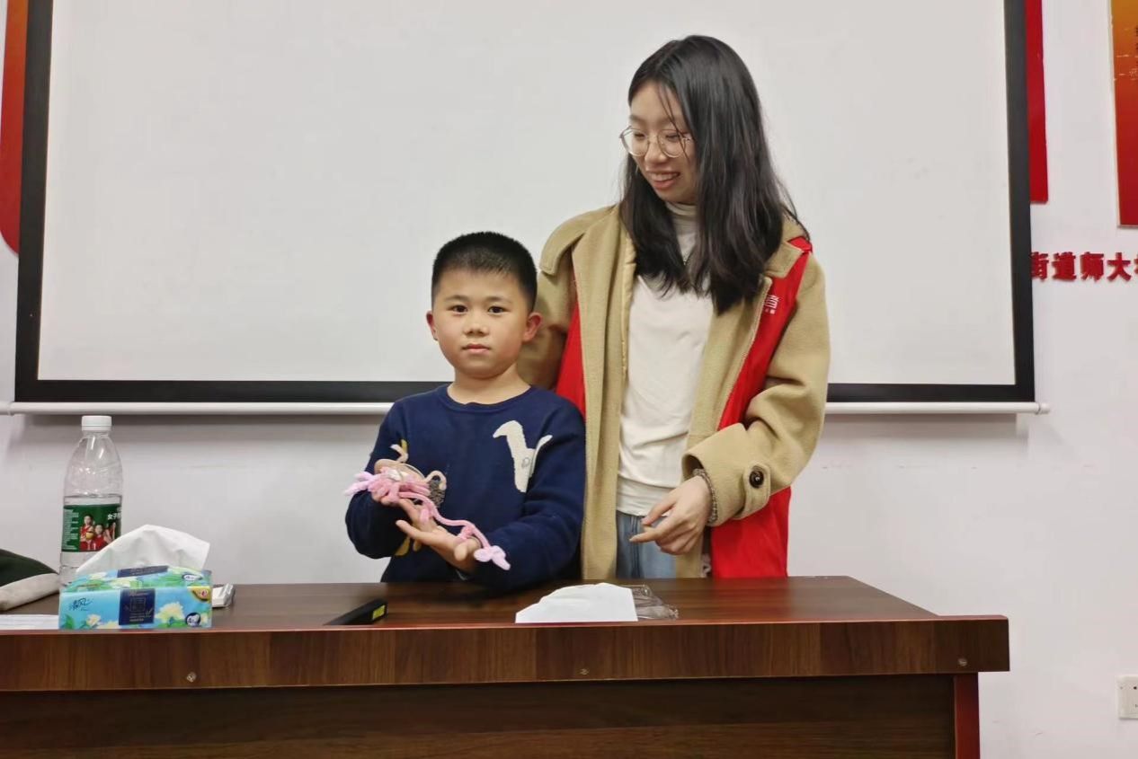 活动开始后,主讲人向小朋友们简述了古代中国龙纹的相关知识,以历史为轴,通过播放不同年代的龙纹图片来叙述龙纹意义的变迁。在讲解过程中,小朋友们被形态各异的龙纹图片吸引,提出自己的疑问,主讲人耐心解答,小朋友们也积极地参与课堂互动。随后,在志愿者的帮助下,小朋友们使用自己手中的扭扭棒,充分发挥想象力,制作了自己心目中“龙”的形象。在活动的最后,小朋友们纷纷上台展示分享自己各具特色的作品,与志愿者合影留念。