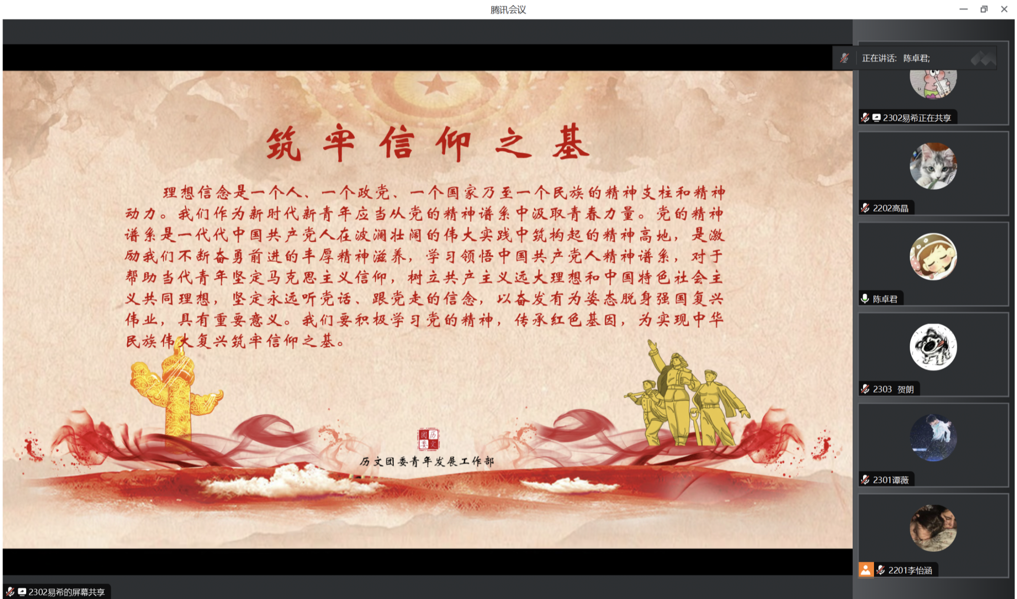 4月4日中午,英国365集团春华团校“强化思想淬炼,筑牢信仰之基”理论培训在线上开展。此次培训由历文院团委书记陈卓君主讲,春华团校全体学员参加。