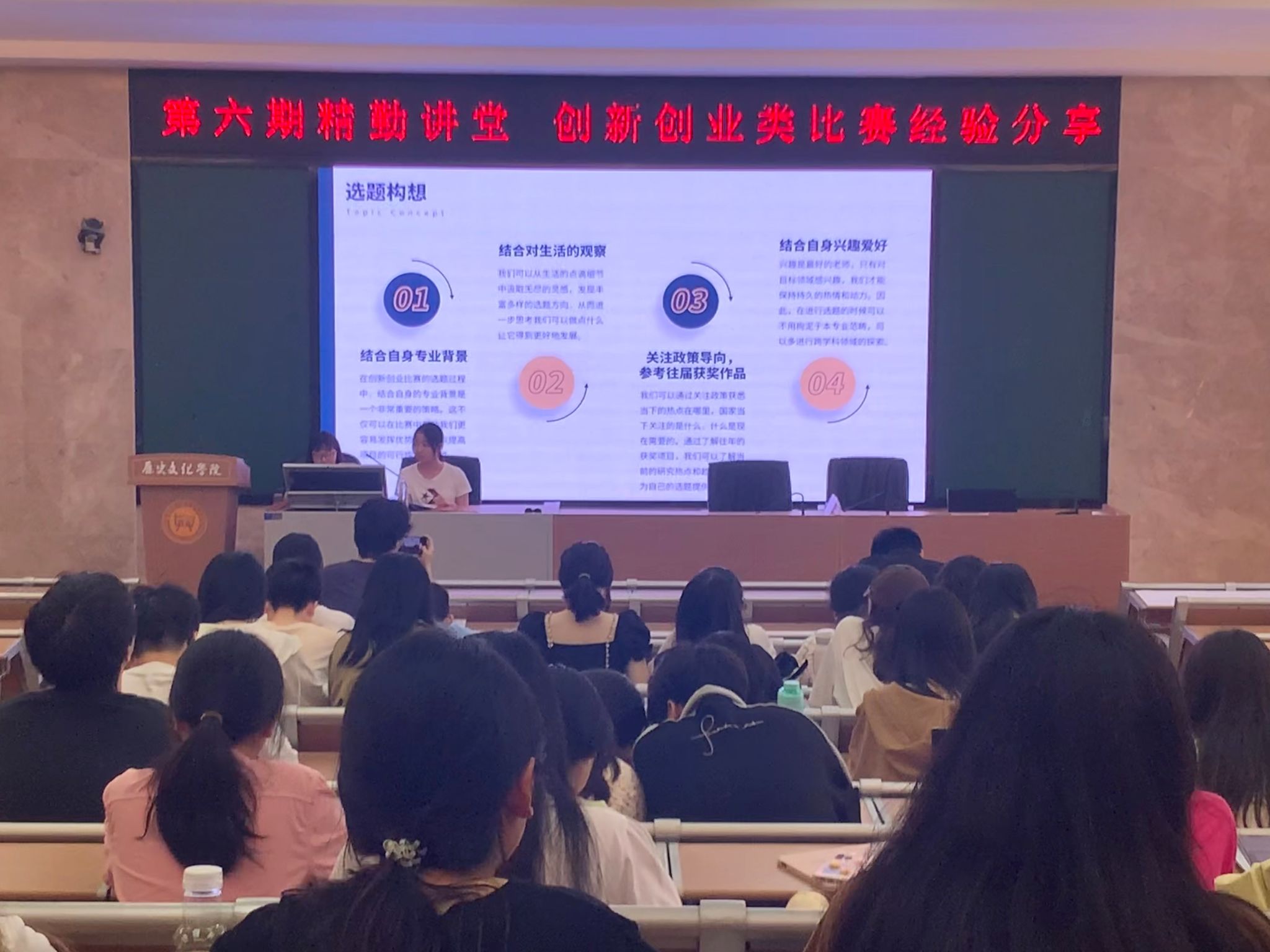 讲堂伊始,陈芝佑、杨凡从选题构想出发,明确选题方向的重要性,鼓励同学们结合自身专业背景、对生活的观察、政策导向以及自身兴趣爱好来确定选题方向。紧接着,她们对备赛过程进行了详细阐述,建议团队在组建时可以进行文理结合,确保团队的互补性。在实施过程方面,她们以集体讨论、资料查找、统筹协调为切入点,强调项目实施的可行性。最后,陈芝佑、杨凡以自身比赛经历向同学们分享了比赛的心得感悟,她们希望同学们能够不惧挑战,勇于尝试,在参与比赛的过程中不断地发掘自身潜能,超越自我。