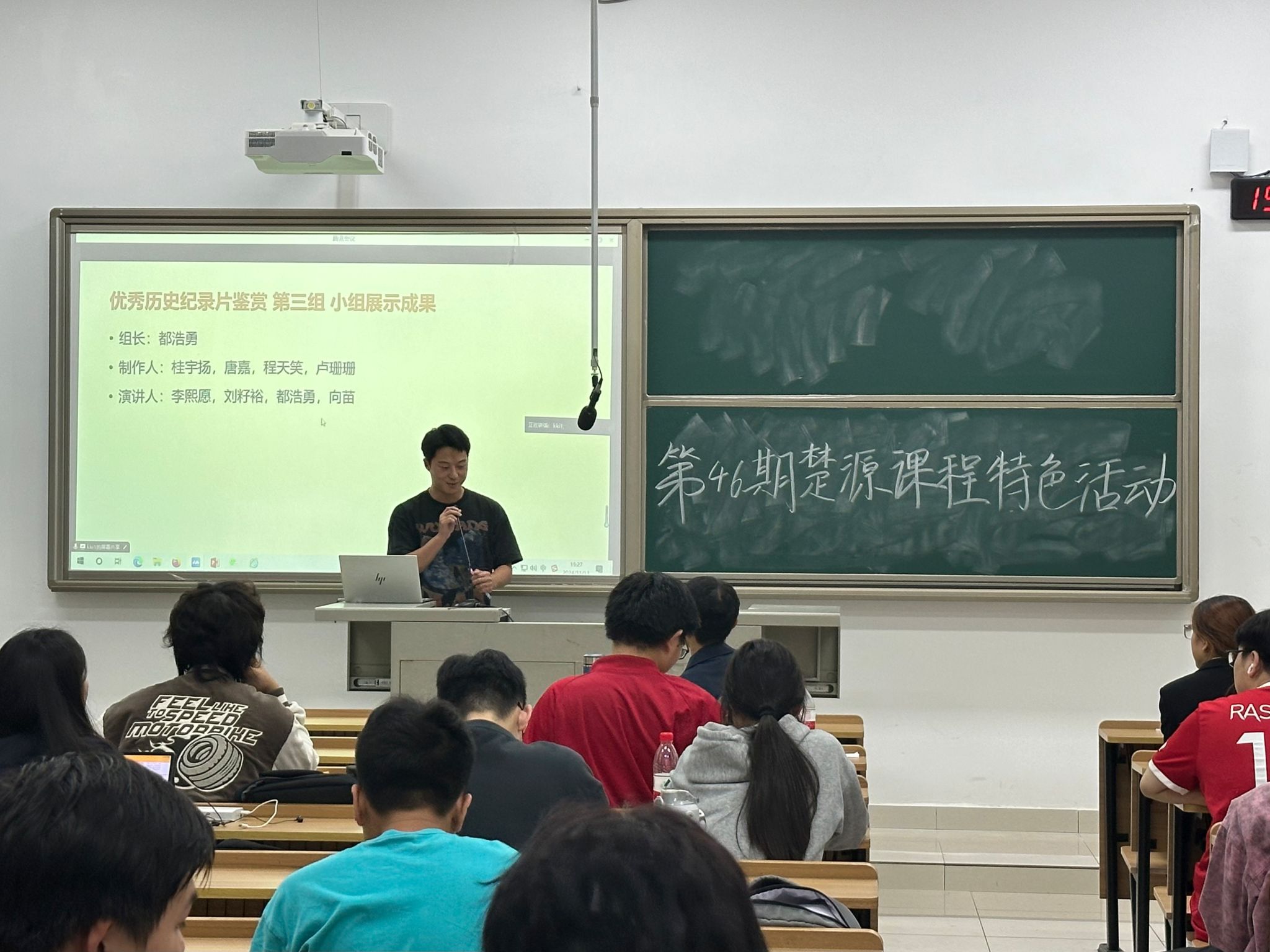 活动伊始,主持人带领大家回顾本学期观看过的纪录片,总结两次户外实践经历的活动成果。随后,学员们以小组为单位依次上台进行展示家乡特色,有“魅力水乡”之称的安乡以及“南方昌盛”之意的南昌等。学员们丰富的展示内容,带大家了解了不同的城市,领略了多样的文化。活动的最后,授课老师李明楠作点评发言,他对各组的展示内容给予充分的肯定并希望同学们能从日常生活的细节里发现历史的独特魅力。