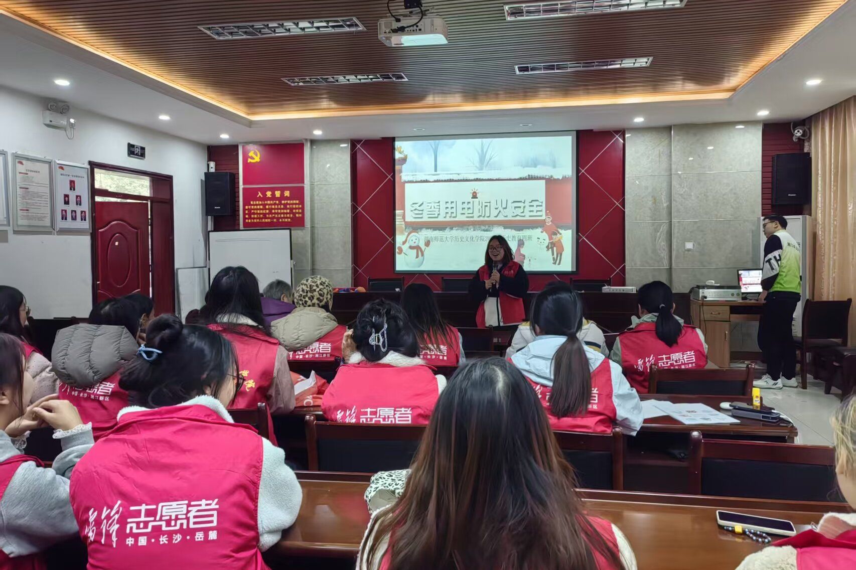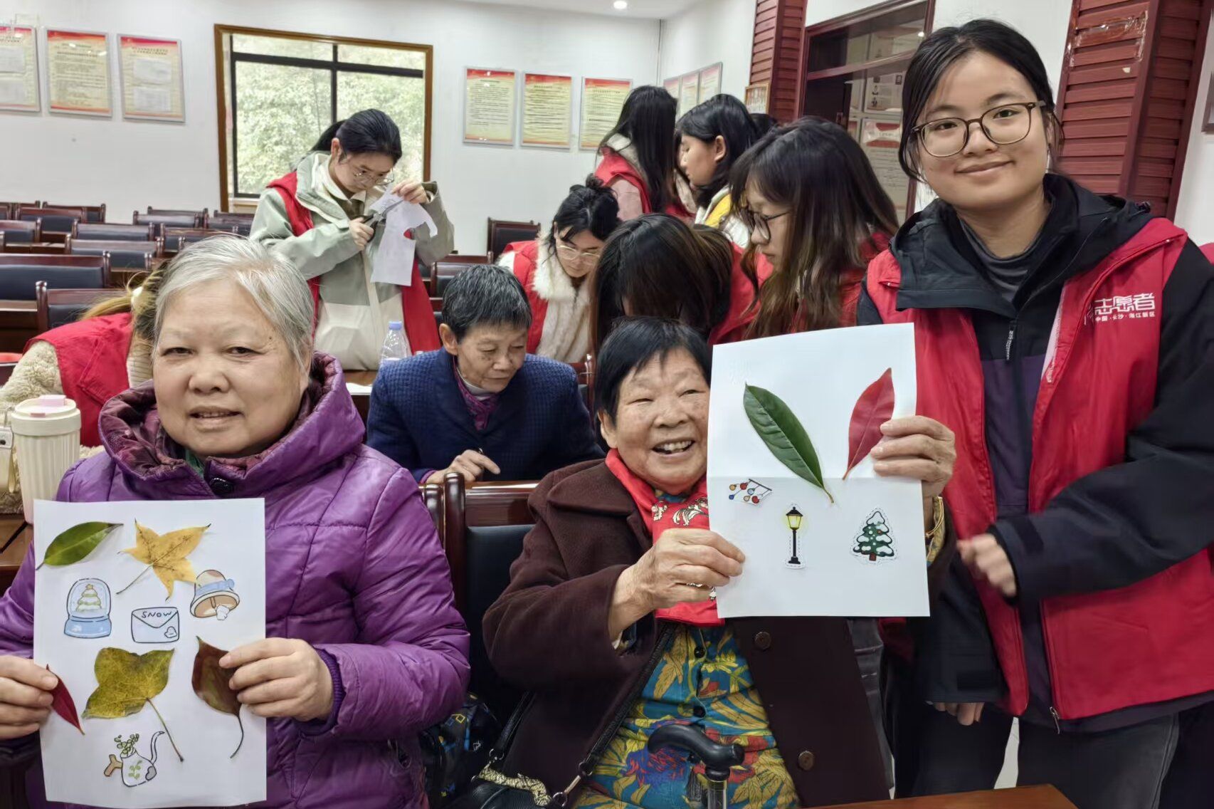 活动伊始,志愿者在负责人带领下提前三十分钟抵达湖东社区公共服务中心集合,并领取各自工作任务。活动随后分为两个环节展开:在安全宣讲环节,志愿者宣讲员借助幻灯片,向社区老人讲解冬日用电与防火安全知识。讲解过程中,志愿者通过实例说明和互动问答,帮助老人进一步理解日常生活中可能存在的安全隐患及应对方法;随后进行的拼贴画创作环节中,每两位志愿者协助一位老人,共同完成拼贴画作品。活动接近尾声时,志愿者将完成的拼贴画作品进行集中展示,并逐一为参与活动的老人送上纪念品。最后,全体志愿者与社区老人合影留念,为此次暖冬志愿服务画上句号。