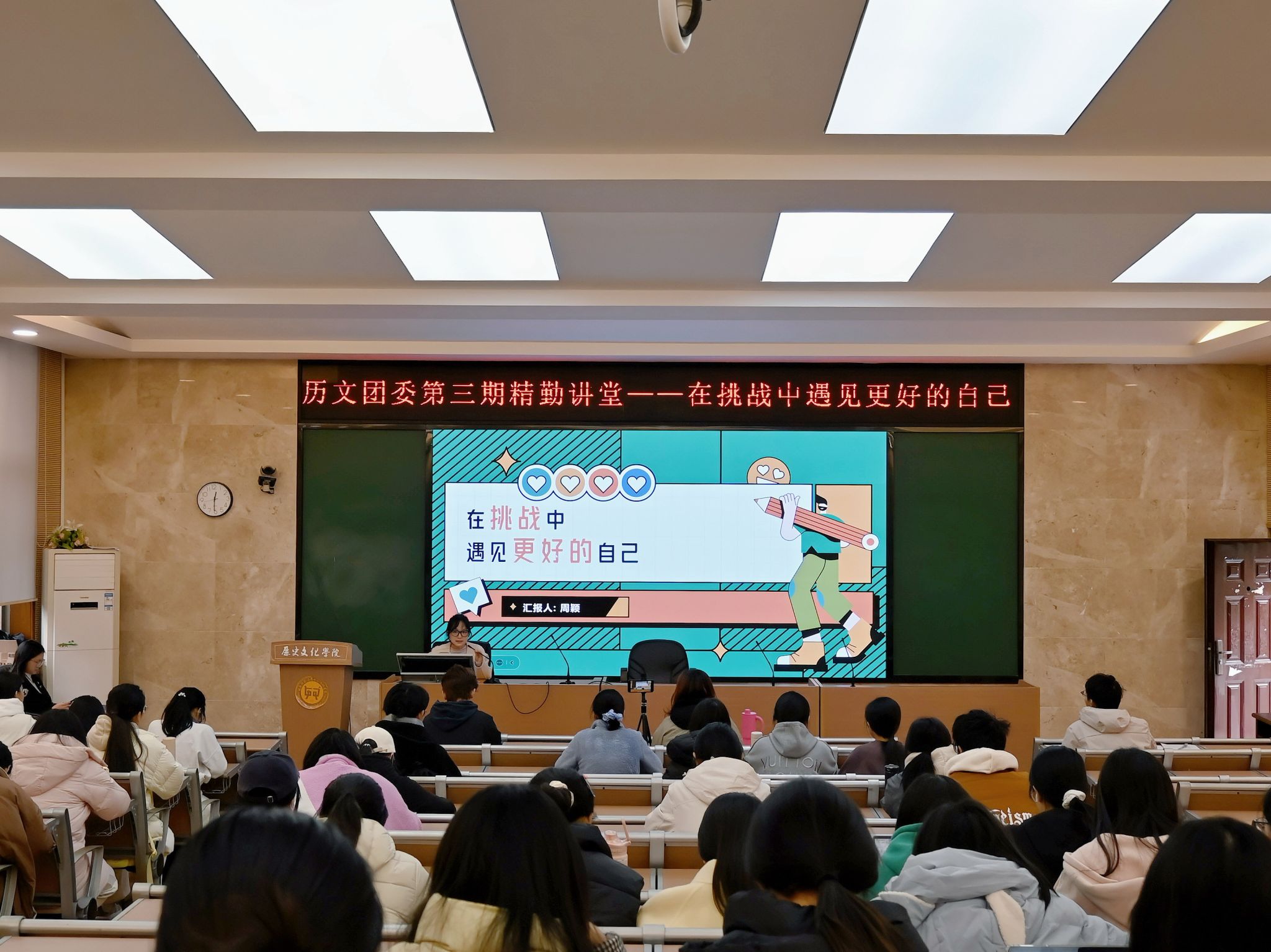 (通讯员 刘念 李采宸)12月4日中午,英国365集团团委青创部在历文院203学术报告厅举办第三期精勤讲堂“在挑战中遇见更好的自己”。此次活动由2023级周颖同学主讲,青创小组全体成员参加。