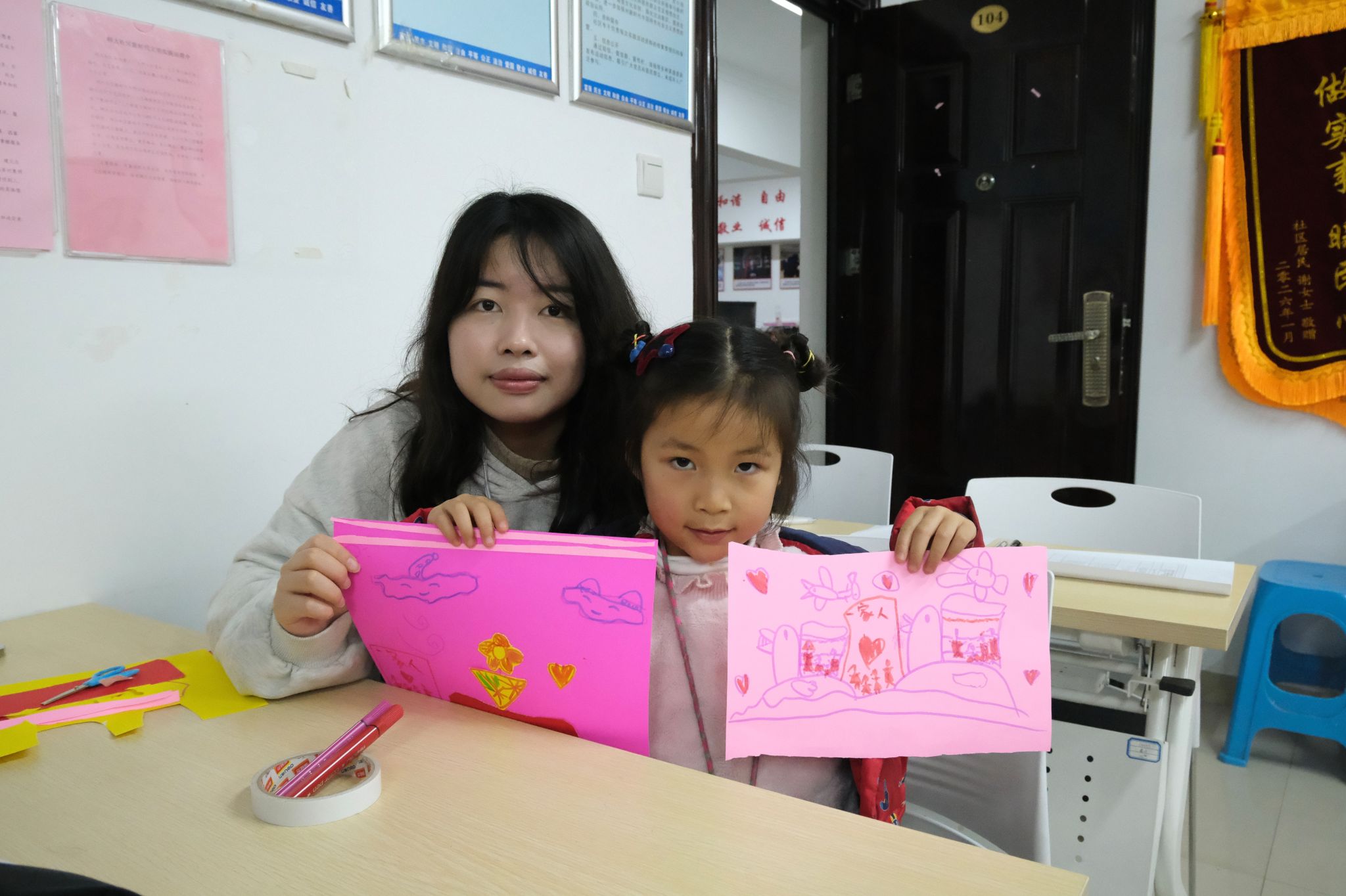 手工环节中,小朋友们在志愿者的协助下,运用卡纸、彩纸进行裁剪与拼贴,制作“微型织锦”作品,并依次上台分享设计理念、展示作品。