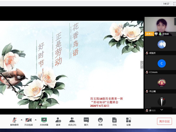 (通讯员 刘诗晨)为帮助学生树立良好的劳动观念,4月22日下午,2018级历教一班在腾讯会议上开展以“花香鸟语正是劳动好时节”为主题的班会。此次会议由2018级历教一班班长许程超主持,劳动委员胡海芳协助,2018级历教一班全体成员参加。