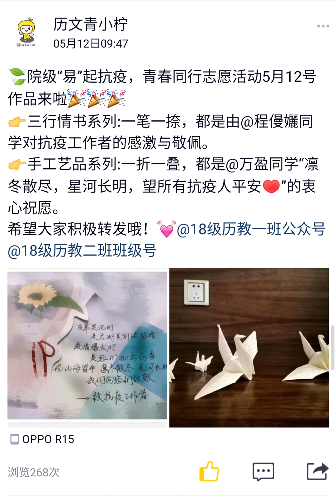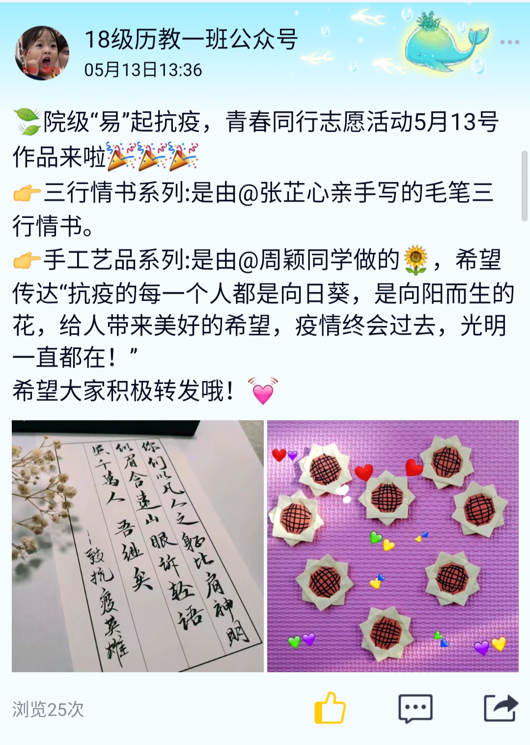 活动开始前,负责人对志愿者进行分工,分为“三行情书”和“手工艺品”两个小组,并且提前通知志愿者准备好作品。在5月11日至5月18日期间,志愿者准时上交活动作品图片以及相关寄语,负责人通过班级公众号和院青工部公众号进行宣传。负责人在此期间与志愿者随时保持联系,接收志愿者们的反馈,及时解决突发状况,并在活动结束后进行评比,对此次活动中表现突出者酌情奖励。
