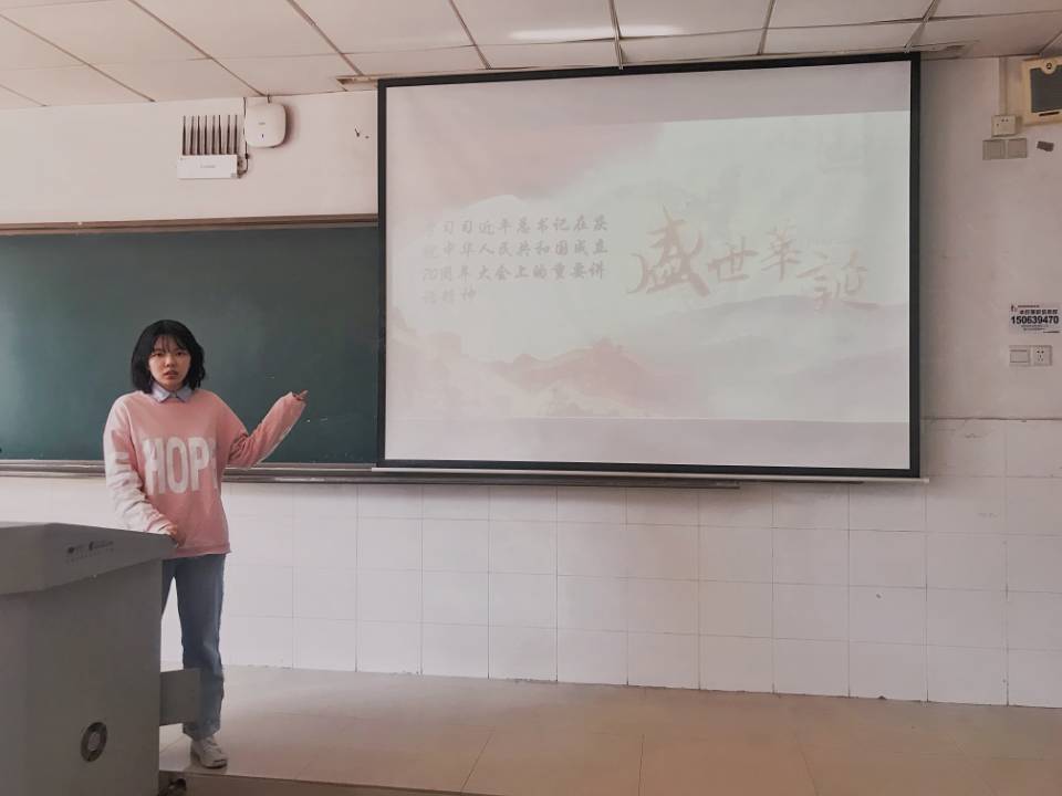 活动伊始,卢晨昱围绕“盛世华诞”的主题进行幻灯片宣讲,主要回顾了过去七十年来中国共产党的工作成就。宣讲过后,青马小组成员对此次主题有了一定的掌握与了解。接着,全体成员观看了70周年大会讲话视频,进一步了解这七十年来的风风雨雨。最后青马小组全体成员针对习近平总书记重要讲话精神进行了讨论。谭梦婷说到,七十年来,共产党人“不忘初心,牢记使命”,这种精神值得我们学习,不忘初心,砥砺前行,为实现中华民族伟大复兴的中国梦而努力奋斗!