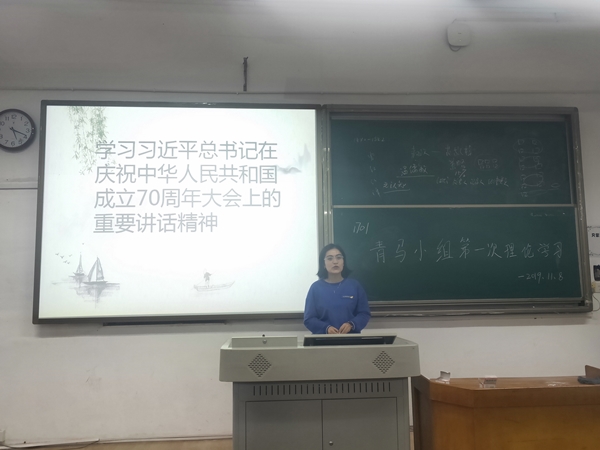 活动伊始,古扎丽努尔介绍了此次学习活动的背景、目的以及重要性。随后带领大家学习了习近平总书记在庆祝中华人民共和国成立70周年大会上的重要讲话精神,更加深刻的理解了中华人民共和国成立的伟大意义,认清了党和国家事业发展面临的新形势、新任务、新要求。活动最后,小组成员纷纷阐述了自己对习近平总书记讲话内容的感悟。刘杭波同学发言谈到:“我们要坚信新中国的明天将会更加美好,作为新时代的大学生,我们要争做新时代新青年,继续为实现“两个一百年”奋斗目标、实现中华民族伟大复兴的中国梦而努力奋斗。”