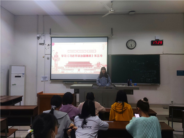 活动开始,唐诗雯首先向小组成员介绍了此次学习活动的主要内容以及学习目的。随后结合PPT的演示内容,对《习近平谈治国理政》第三卷一书中的十九个板块进行了简要的讲述。小组全体成员认真听讲。进入自由讨论和发言环节,大家积极发表自己的观点。唐诗雯在发表自己的观点时谈到,我们作为历文院的学生,应该将自身的专业同爱国精神传承相紧密结合。最后,唐诗雯对此次学习交流会进行总结,并希望大家能够自觉地将今天的感悟,结合到自己今后的实践相结合。