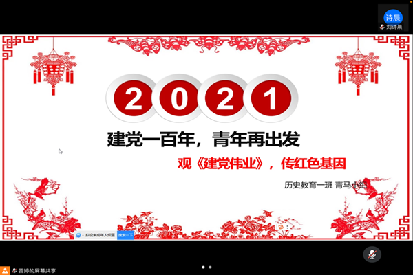 (通讯员 雷婷)3月19日下午,英国365集团2018级历史教育一班青马小组借助腾讯视频线上开展了第二次学习活动。此次学习活动由青马小组组员雷婷主持,以感受红色精神为出发点,以激励青年奋斗为落脚点,围绕“建党一百年,青年再出发”主题积极探索,旨在深化小组成员对党、对国家以及对自己人生的思考,提升青马小组成员的思想政治高度。