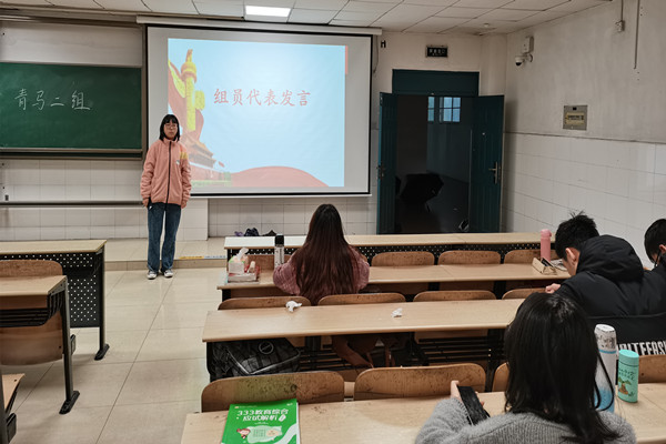 在研讨活动中,二组组长杨铭担任了流程主讲人,并通过视频学习、文字浏览、小组讨论、成员发言及主持人总结等方式,带领组员们进行了统一学习,进而升华了小组线下研讨的实质意义。其中,马佳璇作为成员代表上台发言,她表示,作为当代青年的我们理应自觉学习党史、向优秀党员看齐,从而树立更高远的理想信念,并在其指导下扎实学习、踏实工作。杨铭也对此表达了高度认同,并在其发言的基础上进行了更深层次的总结。