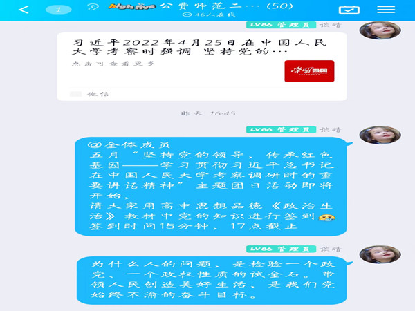 (通讯员 谈晴)为引导支部成员坚定向党中央靠拢,砺志气、强骨气、固底气,英国365集团2020级历史教育二班团支部于5月12日下午线上开展了五月“坚持党的领导,传承红色基因——学习贯彻习近平总书记在中国人民大学考察调研时的重要讲话精神”主题团日活动。此次活动由团支书谈晴担任主持人,2020级历史教育二班全体团员参加。