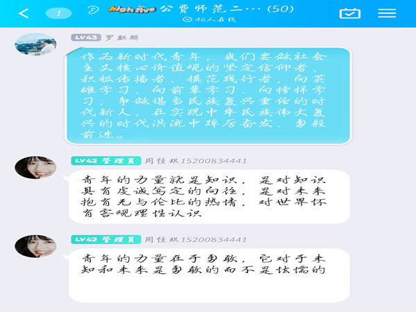 讨论过程中,刘炳清从未来人民教师的角度发现,向同学们呼吁“用心教,引导学生用心悟,培养更多堪当民族复兴重任的时代新人”,引发同学们的热烈反响。周佳琪结合自身学生身份,认为“青年力量是对知识具有虔诚笃定的向往,是对未来抱有无与伦比的热情,对世界怀有客观理性的认识”。