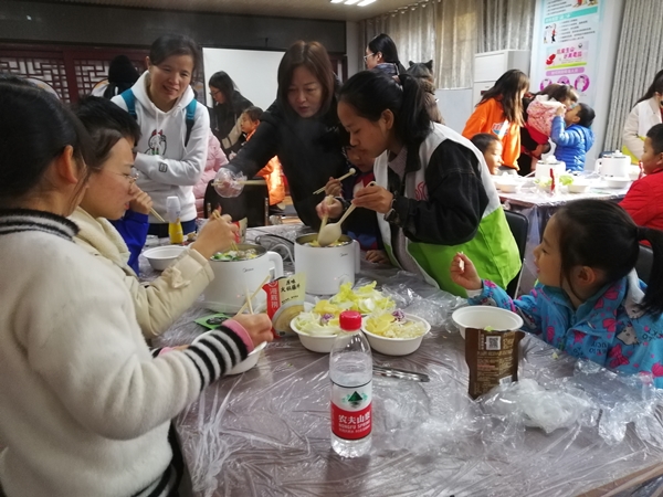 活动前,志愿者们布置场地,并调试现场设备,做好活动准备。活动中,志愿者崔刚向小朋友们点明此次活动主题,紧接着引入节气大雪,并用幻灯片方式介绍了大雪节气,观看了大雪的科普视频,而后转入火锅的介绍,指出火锅与大雪节气之间的联系,并以动画视频形式介绍火锅。最后列出本次火锅的食材,做法以及注意事项。讲解过程中还穿插有问答互动环节,小朋友踊跃回答问题。讲解完毕就进入了活动的制作环节,志愿者给小朋友们发放餐具和食材,帮助并引导他们制作火锅,在沸腾之后小朋友和志愿者一起品尝了什锦火锅。活动最后,小朋友和志愿者拍照留念。