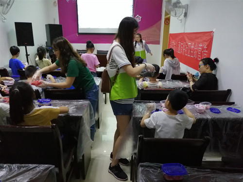 在美食小达人环节中,志愿者们先给小朋友发放了制作奶冻的食材和工具,而后详细介绍了奶冻的制作方法并在小朋友制作过程中加以指导。