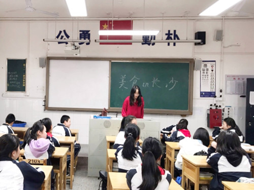 志愿者们在科教新村公交站集合,一同前往湘一芙蓉第二中学,提前完成了课前准备工作。活动伊始,杨瑞雅为同学们播放了一段“美食系列之长沙”为主题的视频,并向同学们提问了关于长沙美食趣闻,同学们也在互动问答环节中积极参与、热烈讨论。杨瑞雅在课堂的分享交流后将课程内容引申,讲解美食因地域而产生的差别,以培养学生对家乡的归属感和自豪感。杨瑞雅简要地进行了课堂总结并回答了同学们提出的相关问题,并向表现活跃的同学发放了奖品。同时,志愿者还和学生们一起清扫整理活动教室。