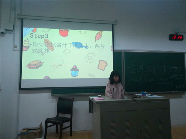 活动伊始,王玮婷播放幻灯片向会员们讲述了三明治的起源发展和三明治的制作方法,会员们认真听讲,初步了解了三明治的做法。随后,会员们分成小组着手开始DIY制作三明治,理事们在现场进行指导,帮助会员完成三明治的制作。活动后期,会员们互相分享品尝制作好的三明治,交流制作经验,相关理事对会员们的作品进行拍照留念。活动结束后,理事和项目组的成员一起打扫教室,理事们向项目组的成员表示了感谢。社团监事会对此次会员活动中出现的问题提出有效建议,有利于下一次活动的开展。