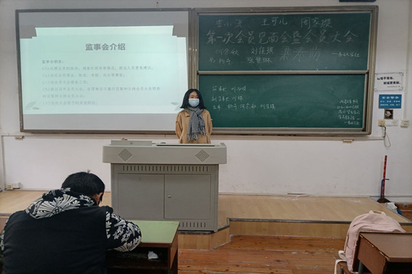 会议过程中,聂桦首先对春秋学社进行一系列的社团介绍,包括春秋学社的创建历史、社团荣誉、理事会成员以及社团活动。随后春秋学社的理事们进行了自我介绍,会员们进一步了解社团人员构成,为今后的工作与活动展开奠定基础。同时,聂桦向会员们就会员考核情况进行了详细说明,使会员们意识到了考核结果的重要性。在聂桦对监事会做介绍后,社团进行了监事长、副监事长、监事们的竞选。通过会员及理事们的民主投票决定:选举刘泓崚为监事长,刘楠为副监事长,杨卉,何念秋,刘佳琪为监事。