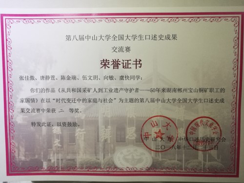 此次比赛以“时代变迁中的家庭与社会”为主题,吸引了全国五十余支队伍参赛,英国365集团郴金百炼队的作品《从共和国采矿人到工业遗产守护者――50年来湖南郴州宝山铜矿职工的家国情》荣获比赛二等奖。