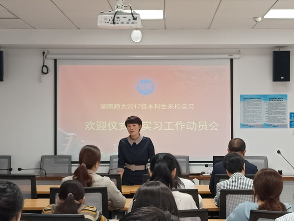 第一实习队在雅礼麓谷中学门口集合并拍照留影,之后前往行政楼二楼会议室参加雅礼麓谷中学举办的“湖南师大2017级本科生来校实习欢迎仪式暨实习工作动员会”。会议中,雅礼麓谷中学副校长进行发言,首先他代表雅礼麓谷对实习队的到来表示欢迎,其后强调实习的重要性,认为实习是当老师上岗前的培训,最后他对本校老师和实习老师都提出了几点要求:本校老师要做到倾囊相授、言传身教以及实习老师要严格遵守本校与实习队的纪律、重视安全问题以及不溺爱学生要同学生一起提升自我。实习指导老师成丽,对此次实习机会表示了感谢。