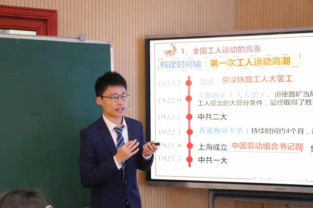 上午九时,“建党百年,牢记历史”主题汇报课活动准时开始。初中组汇报课授课内容是部编版教材八年级第十四课《中国共产党诞生》。授课人刘文中同学以陈望道将墨汁当糖的故事导入本课,通过史料教学的方式讲解了中国共产党成立的条件,通过使用视频创设历史情境和自主探究的方式介绍了中共一大、二大的内容,并以表格对比的形式深入探讨了中共一大的历史意义。随后,刘文中回顾了中共领导全国工人运动的历程。最后,他通过数据对比的方式将本课内容升华至红船精神,渗透了家国情怀这一历史学科核心素养。