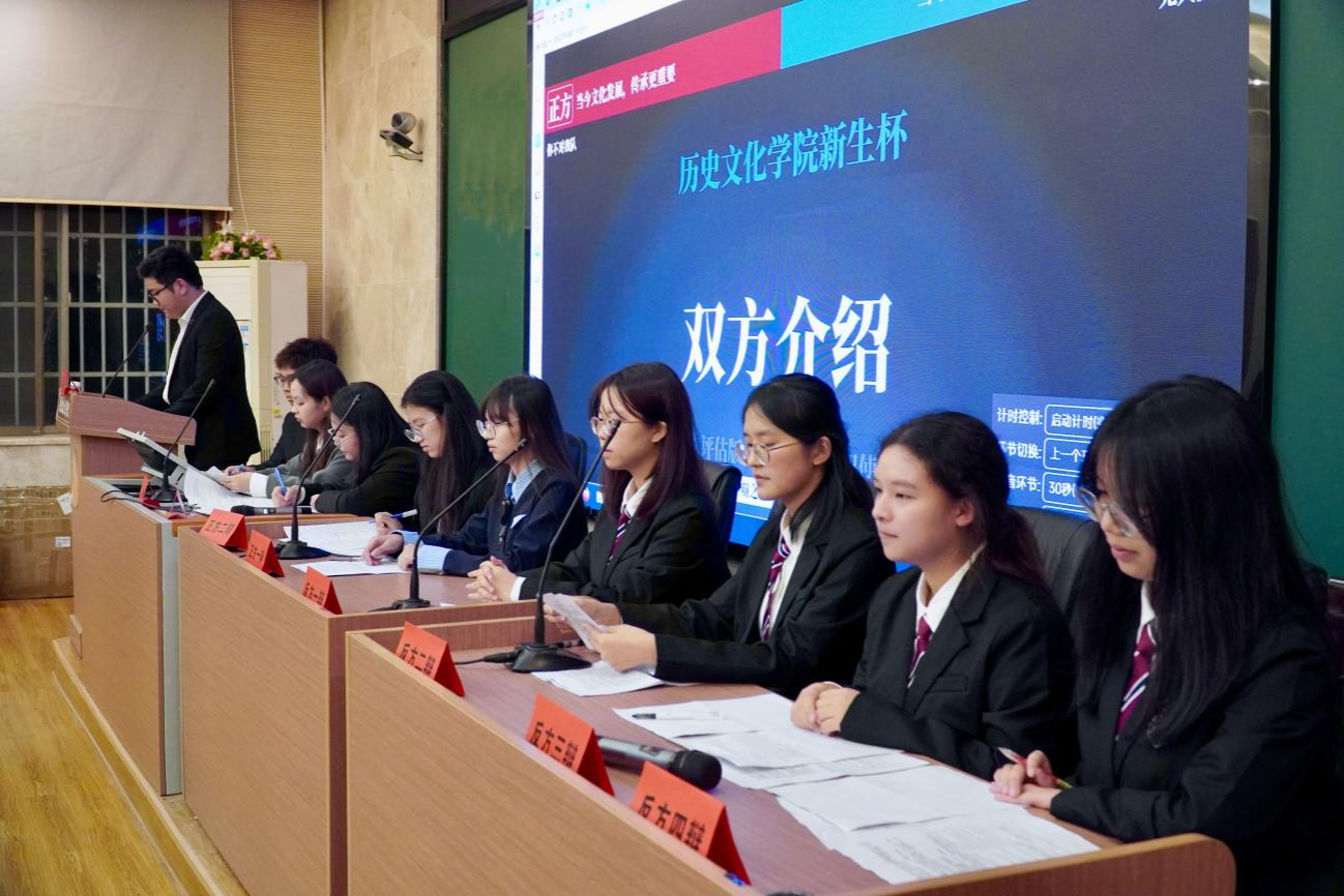 此次比赛的辩题为:当今时代文化传承/创新更重要。双方辩手进行自我介绍之后,依次进行了立论、质询、驳论、对辩、小结、自由辩论、结辩的环节。双方辩手就论题讲述了自己的看法,彰显了独到的辩论思维,体现了团队的合作精神。