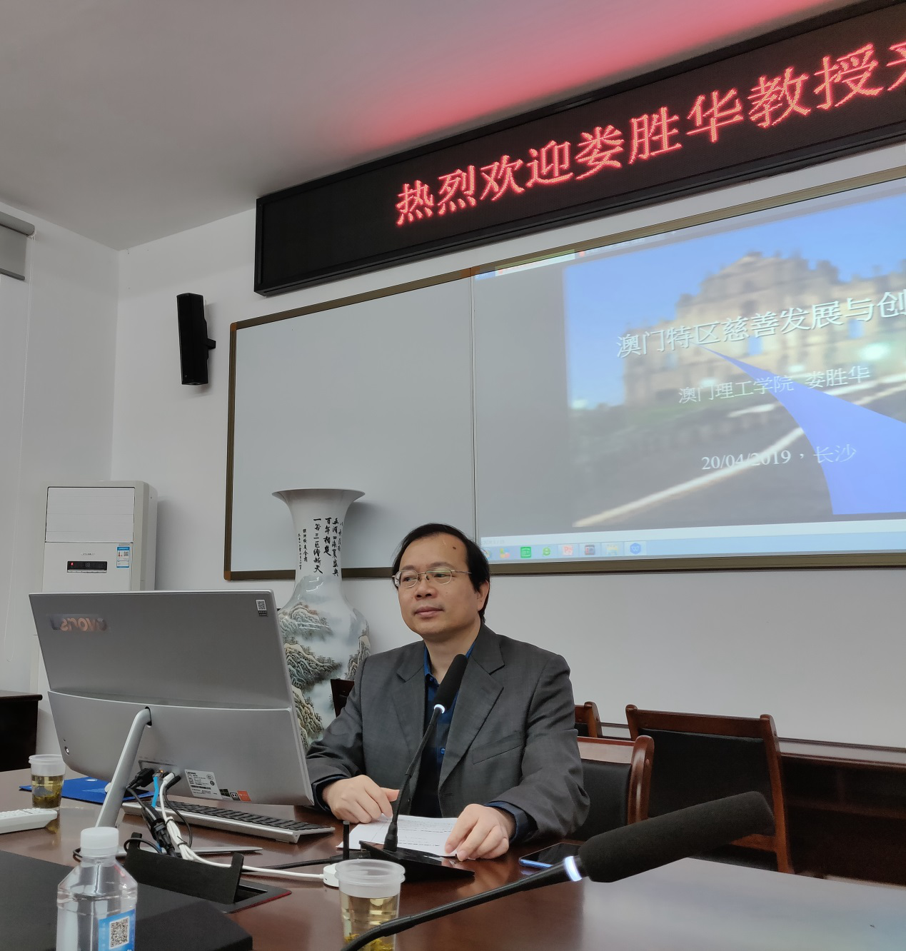 (通讯员 梁坤莲) 2019年4月20日,应英国365集团慈善公益研究院邀请,澳门理工学院公共行政学教授娄胜华老师为慈善公益研究院师生作题为《澳门特区慈善发展与创新》的学术报告,慈善公益研究院院长周秋光教授等出席本次报告。作为曾先后兼任澳门特区政府行政法务司司长办顾问、特区政府可持续发展策略研究中心非全职顾问、特区政府社会工作委员会委员、澳门社会治理研究学会理事长、澳门新视角学会会长、中华慈善百人论坛召集委员等多项社会职务的学者,娄胜华教授对澳门特区的慈善公益的发展和慈善团体如数家珍。