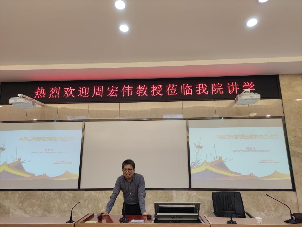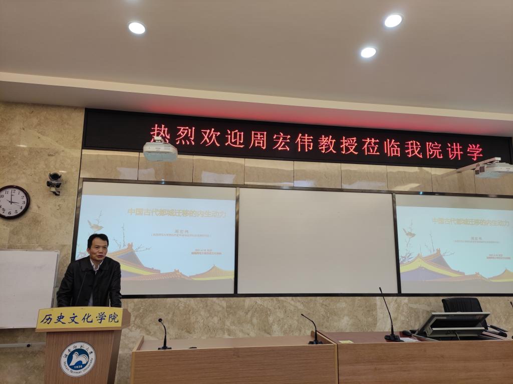 (通讯员王聃)4月19日,历史文化院于203学术报告厅开展题为“中国古代都城迁移的内生动力”主题讲座。陕西师范大学二级教授、博士生导师、《中国历史地理论丛》主编周宏伟教授应邀主讲。讲座由我院院长钟声教授主持。