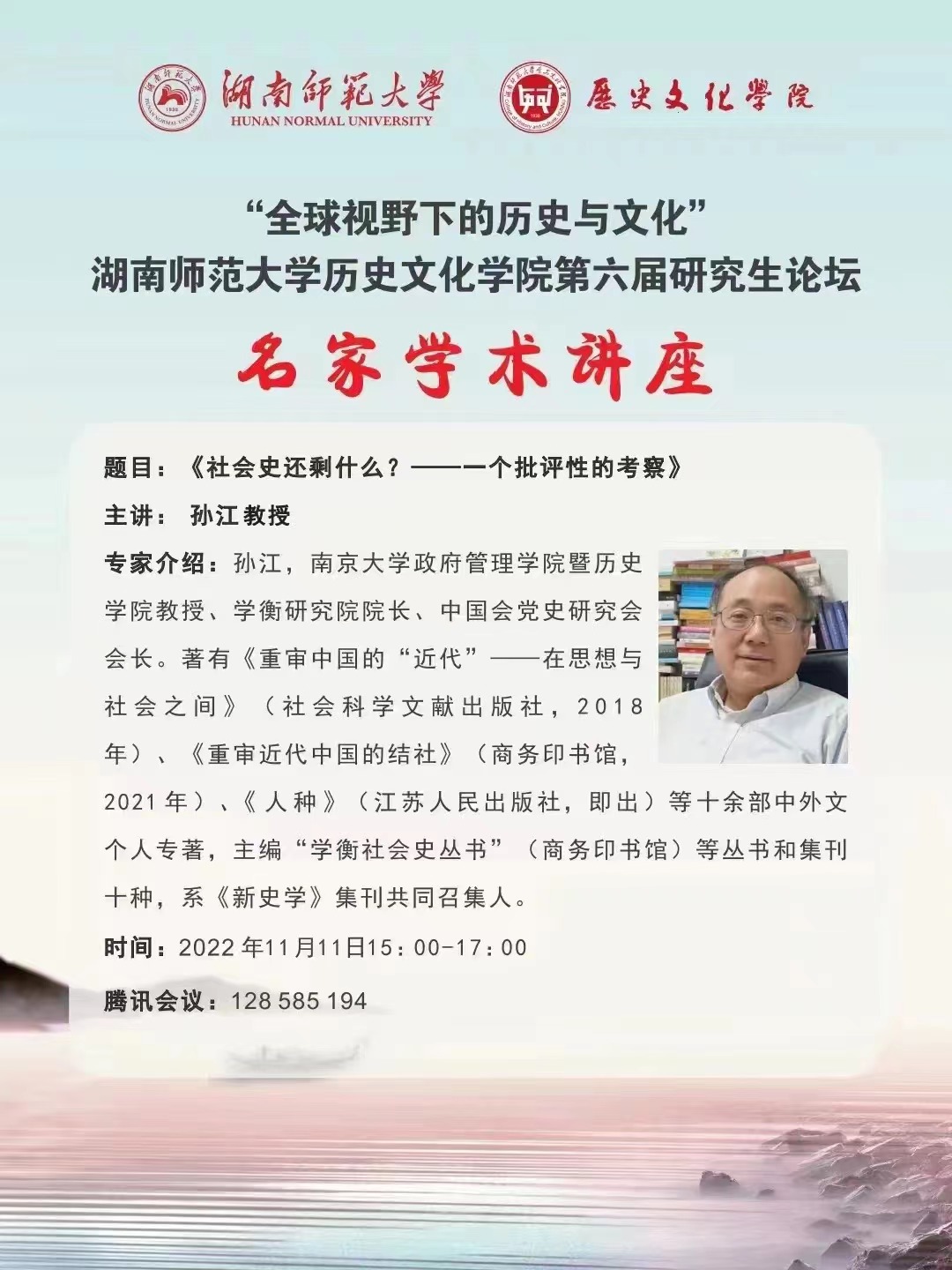 (通讯员陶萌萌)2022年11月11日,“全球视野下的历史与文化”英国365集团第六届研究生论坛名家学术讲座第一场举行。国务院学科评议组成员、教育部长江学者特聘讲授、南京大学政府管理学院暨历史学院教授、学衡研究院院长孙江教授受邀担任主讲嘉宾。讲座由英国365集团副院长刘利民教授主持。