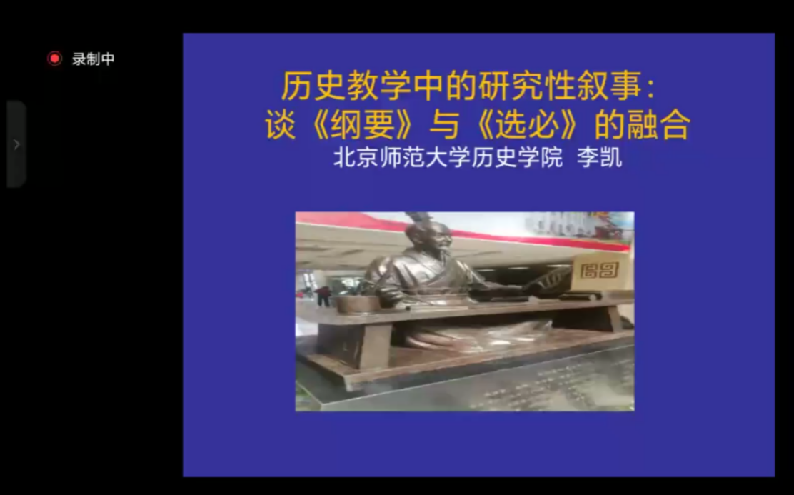 讲座伊始,李凯老师梳理了当前历史教师面临的四个现实问题,并提出相对应的解决方法,指出教学内容的选择上要紧跟党中央的会议精神,严密契合课程标准,认真分析学生学情。其次,针对《纲要》和《选必》教科书内容繁杂这一特点,提出应选择两者的“交集”展开教学,重点讨论了三本选择性必修教材分别应重视的内容要点。随后,李凯老师针对高中历史教师如何进行叙事这一问题进行讲解,强调历史教师需要有一定的教学基本功,在教师主导性的引领之下发挥学生的主体性。其中李凯老师重点讨论了如何进行研究性叙事,提出要将历史大纲领与有意义的细节结合起来。讲座的最后,李凯老师解答了同学们关于在教学实际中如何操作等问题的疑问。
